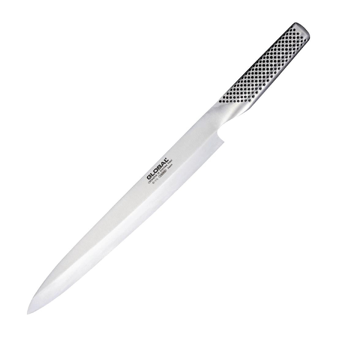 The G-11 25cm Yanagi is a specialist Japanese knife for preparing sushi and sashimi. The long single bevelled blade allows the user to make clean, controlled cuts in a single stoke. The back face of the blade is concaved which creates non-stick properties and allows sliced pieces to be removed easily after cutting. This prevents tearing and bruising of the flesh. As this knife is made from a single bevelled edge, it can only be sharpened by using a whetstone. We recommend using a super fine grit stone to finish the sharpening process as it will create a smooth and shiny surface that will maximise taste of the fish.